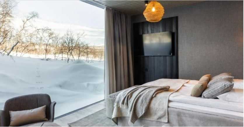 Inside, rooms are spacious, modern, and rooted in Nordic design. Every detail has been curated for comfort and relaxation after a day exploring the Arctic outdoors. Rear-facing rooms feature floor-to-ceiling windows that open up to uninterrupted views of Saana – a mountain steeped in local myths and legends.