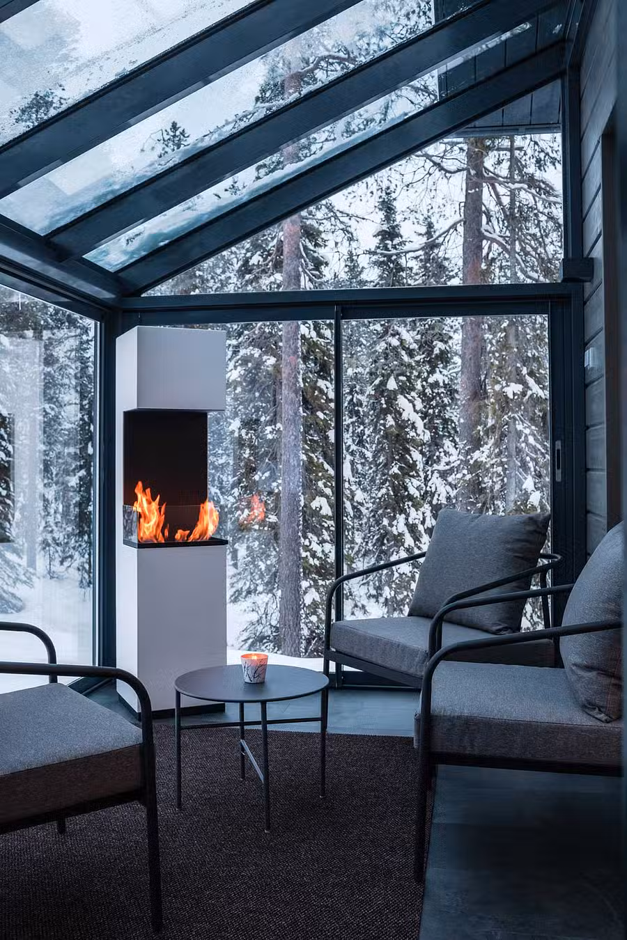 Arctic viewing room with a fireplace and large windows offering panoramic views.