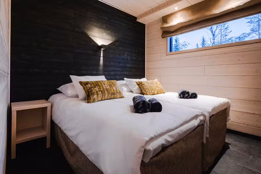 A 2-bedroom cottage, sleeping up to 6 persons and overlooking the ski slopes in Pyha. The cottages offer luxurious accommodation with an emphasis on contemporary Scandi furnishings and design. There are 2 twin-bedded rooms, plus a large full-size double sofa bed in the lounge. In addition, a luxury double shower room and separate WC. Plus a traditional sauna. There is a high-spec kitchen with separate utility room and drying cupboard. The open-plan lounge/diner, extends into an Arctic viewing room with a fireplace and large windows offering panoramic views.