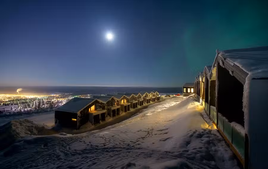 Designed to blend effortlessly into the surrounding wilderness, it features expansive windows — perfect for catching a glimpse of the Northern Lights dancing across the night sky. Whether or not the auroras appear, you'll be captivated by the vast skies, the ethereal forest, and the twinkling lights of the distant town below.
